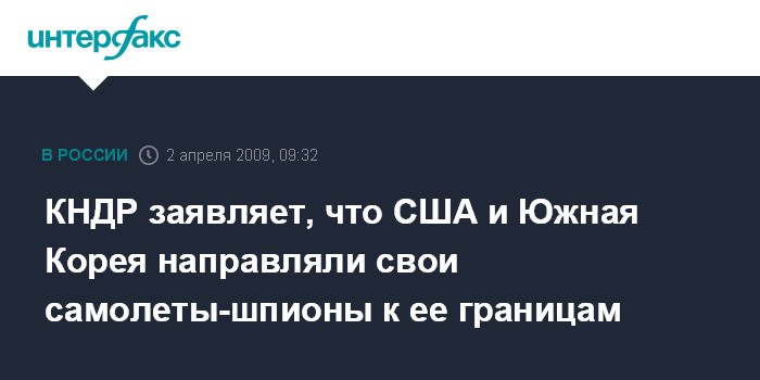 Москва. 2 апреля. INTERFAX.RU - Власти КНДР обвинили США и Южную Корею в том, что они направляли свои самолеты-разведчики к границам Северной Кореи накануне испытания ракеты в КНДР, намеченной на начало апреля, сообщил в среду американский телеканал Си-эн-эн.