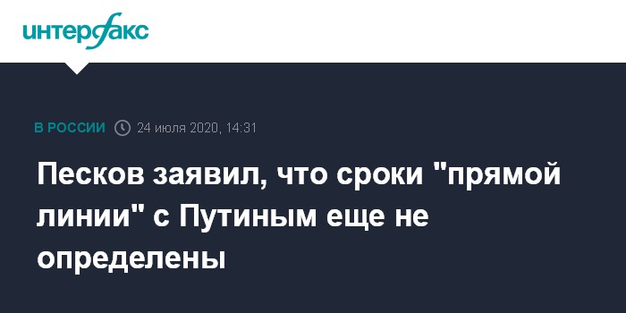"Сроки проведения "прямой линии" пока не определены", - сказал Песков "Интерфаксу", отвечая на вопрос, означает ли это поручение, что "прямая линия" в этом году пройдет не раньше октября.