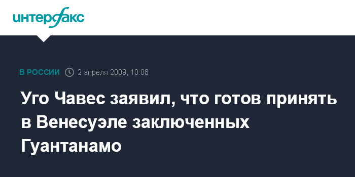 Москва. 2 апреля. INTERFAX.RU - Президент Венесуэлы Уго Чавес заявил, что может принять в своей стране заключенных, содержащихся в центре задержаний на американской военной базе Гуантанамо, сообщила в четверг британская телерадиокорпорация Би-Би-Си.