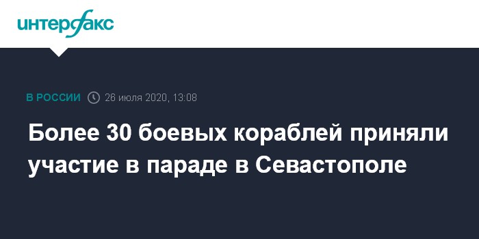 Москва. 26 июля. INTERFAX.RU - Свыше 30 боевых кораблей, подводных лодок и катеров, 14 вспомогательных судов, около 30 летательных аппаратов и более 50 единиц техники армейского корпуса приняли участие в военно-морском параде в воскресенье в День ВМФ РФ в Севастополе, сообщил Черноморский флот России.