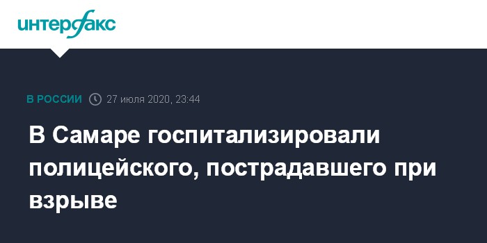 Москва. 27 июля. INTERFAX.RU - Самарский полицейский, пострадавший в результате взрыва неустановленного предмета, брошенного в него местным жителем, госпитализирован, сообщили агентству "Интерфакс" в СУ СКР по Самарской области.