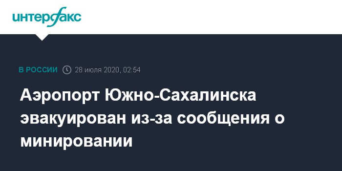 Москва. 28 июля. INTERFAX.RU - Пассажиры и персонал аэропорта Южно-Сахалинска эвакуированы во вторник утром из-за поступившей информации о минировании здания аэровокзала, сообщили агентству "Интерфакс" в пресс-службе аэропорта.