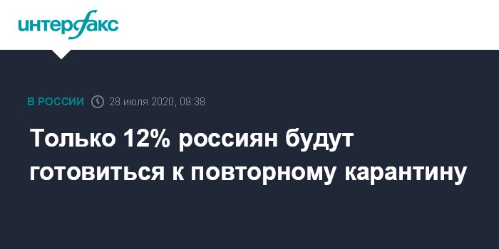 Москва. 28 июля. INTERFAX.RU - К повторному введению режима самоизоляции считают полезным подготовиться 12% россиян, среди людей моложе 24 лет таких 15%, показал опрос Исследовательского центра портала Superjob.