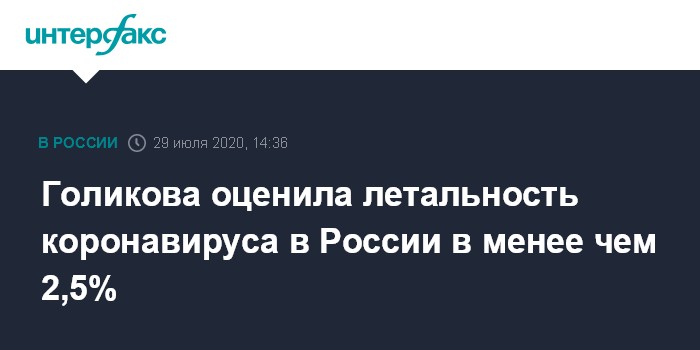 Москва. 29 июля. INTERFAX.RU - В России летальность от коронавирусной инфекции составляет менее 2,5%, это ниже, чем в некоторых других странах, заявила на совещании у президента Путина вице-премьер Татьяна Голикова.
