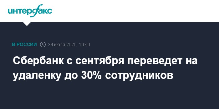 Москва. 29 июля. INTERFAX.RU - Сбербанк России с 1 сентября планирует перевести на удаленную работу до 30% сотрудников, сообщили в пресс-службе кредитной организации. Это новый формат, который не будет зависеть от эпидемиологичесой ситуации.