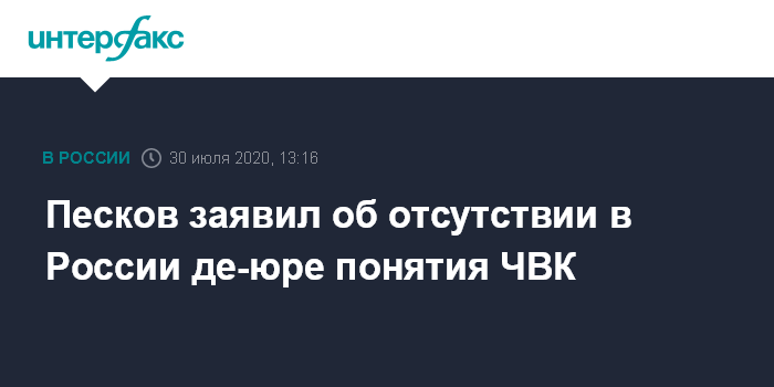 Москва. 30 июля. INTERFAX.RU - Пресс-секретарь президента РФ Дмитрий Песков заявил, что в России частные военные компании (ЧВК) находятся вне закона и об их существовании он не слышал.