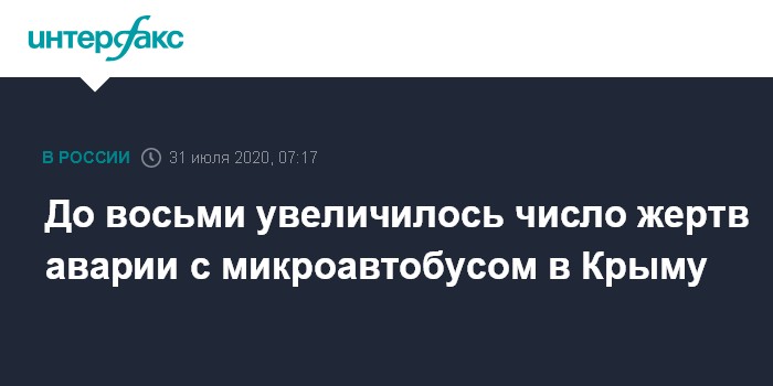 Москва. 31 июля. INTERFAX.RU - Восемь человек погибли в результате столкновения микроавтобуса с грузовиком в Крыму, сообщил "Интерфаксу" информированный источник.