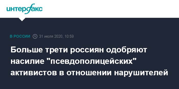 Москва. 31 июля. INTERFAX.RU - По мнению 38% российских пользователей интернета, вигиланты - активисты, берущие на себя функции по охране закона и порядка - имеют право применять к нарушителям силу, показал опрос, проведенный фондом "Общественный вердикт". Об этом пишет "Коммерсантъ".