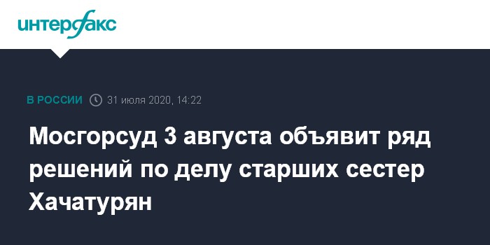 Москва. 31 июля. INTERFAX.RU - Мосгорсуд 3 августа объявит постановление по результатам предварительных слушаний по делу старших сестер Хачатурян. Тогда же суд решит вопрос о продлении им меры пресечения. Крестину и Ангелину Хачатурян обвиняют в убийстве отца.