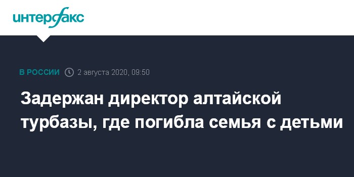 Москва. 2 августа. INTERFAX.RU - Задержан директор турбазы "Глобус" в Алтайском районе Алтайского края, где погибла семья из четырех человек, сообщает пресс-служба СУ СКР по региону.