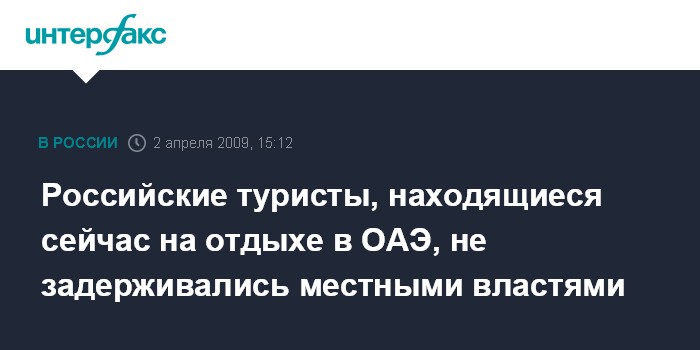 Москва. 2 апреля. INTERFAX.RU - Никто из российских туристов, находящихся сейчас на отдыхе в Объединенных Арабских Эмиратах (ОАЭ), не задерживался властями этой страны, в том числе по подозрению в убийстве бывшего командира батальона "Восток" Сулима Ямадаева, сообщила "Интерфакс-Туризму" пресс-секретарь Российского союза туриндустрии (РСТ) Ирина Тюрина.