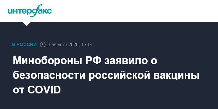 Москва. 3 августа. INTERFAX.RU - Российская вакцина от COVID-19, разработанная научным центром имени Гамалеи Минздрава совместно с Минобороны РФ, по результатам лабораторных и инструментальных исследований безопасна и хорошо переносится, говорится в сообщении Минобороны РФ, которое поступило в "Интерфакс".