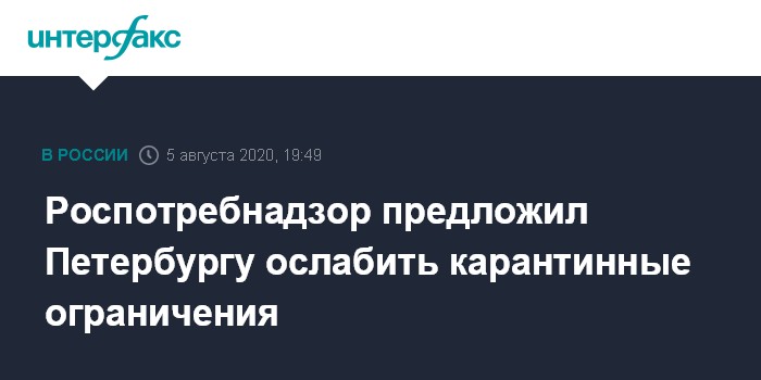 Москва. 5 августа. INTERFAX.RU - Руководитель Роспотребнадзора Анна Попова предложила властям Петербурга перейти ко второму этапу снятия ограничений, введенных из-за коронавируса, сообщил телеканалу "Санкт-Петербург" вице-губернатор Олег Эргашев. По его словам, ситуация с заболеваемостью двусторонней пневмонией и COVID-19 в городе улучшается.