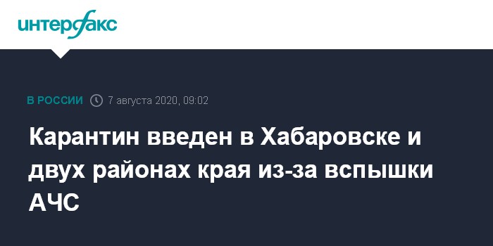 Москва. 7 августа. INTERFAX.RU - Карантин введен на территориях Вяземского и Хабаровского районов, а также города Хабаровска в связи с угрозой распространения африканской чумы свиней (АЧС), сообщает в пятницу пресс-служба правительства региона.