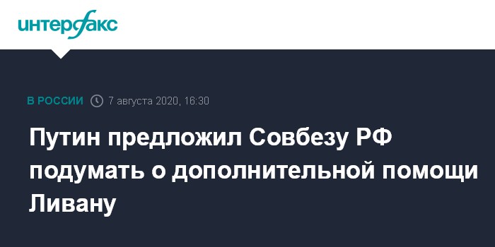 Москва. 7 августа. INTERFAX.RU - Президент РФ Владимир Путин предложил членам Совета безопасности обсудить дополнительные меры поддержки Ливана после взрыва в бейрутском порту.