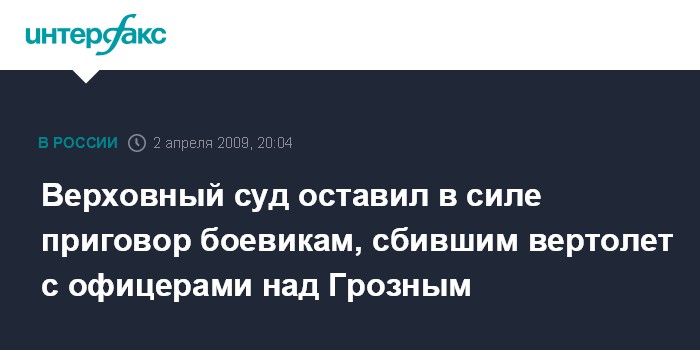 Москва. 2 апреля. INTERFAX.RU - Верховный суд РФ признал законным осуждение на пожизненный срок боевиков, обвиняемых в совершении теракта, в результате которого в 2001 году в Грозном был сбит вертолет с офицерами Генштаба Минобороны РФ, сообщил адвокат одного из обвиняемых Мурад Мусаев.