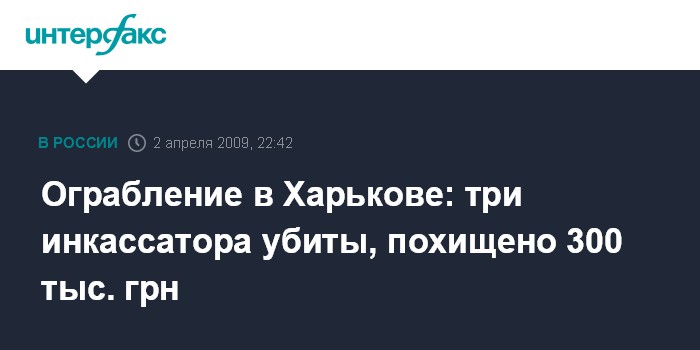 Харьков. 2 апреля. ИНТЕРФАКС-УКРАИНА - В Харькове убиты три инкассатора и ранена случайная прохожая. Преступники скрылись, забрав 300 тыс. гривен.