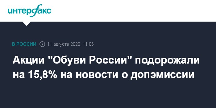Москва. 11 августа. INTERFAX.RU - Совет директоров ПАО "ОР" (головная компания группы "Обувь России") решил увеличить уставный капитал путем дополнительного размещения 28,264 млн обыкновенных акций номиналом 100 рублей каждая. На этом сообщении компании ее акции подорожали утром во вторник на "Мосбирже" на 15,8%, до 39,95 рубля за бумагу.