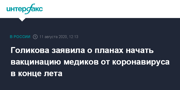 "Как только что мы обсуждали, очень надеемся, что в сентябре - либо в конце августа-сентябре уже начнет появляться вакцина, первой категорией для вакцинирования станут, как мы надеемся, медработники", - сказала Голикова во вторник на совещании президента России Владимира Путина с членами правительства РФ.