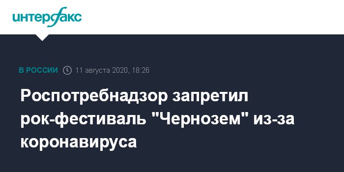 Москва. 11 августа. INTERFAX.RU - Роспотребнадзор запретил проведение ежегодного рок-фестиваля "Чернозем", который должен был состояться 14-16 августа под Тамбовом, из-за эпидемиологической ситуации по коронавирусу.