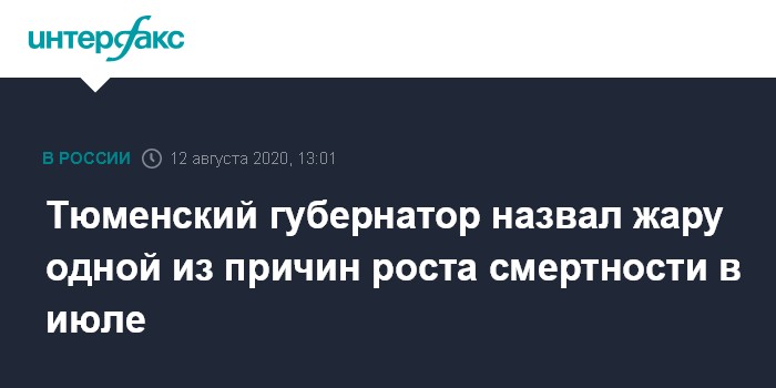 Москва. 12 августа. INTERFAX.RU - В Тюменской области рост смертности в июле мог быть связан с "сильнейшей жарой", из-за нее у пожилых людей с сердечными заболеваниями были серьезные проблемы, сказал губернатор региона Александр Моор.