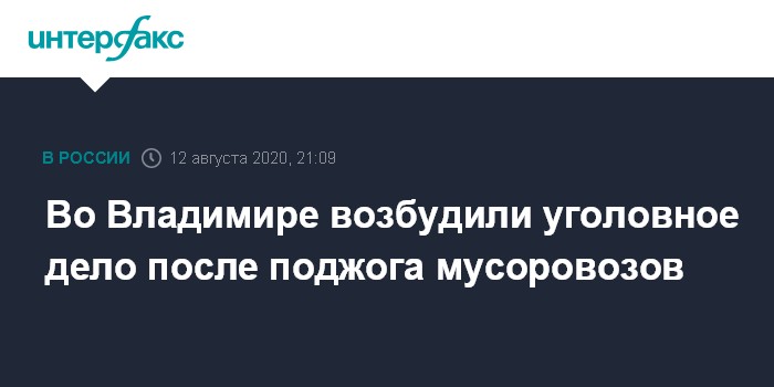 Москва. 12 августа. INTERFAX.RU - Поджог десяти автомобилей для сбора и перевозки мусора будут расследовать во Владимире в рамках уголовного дела.