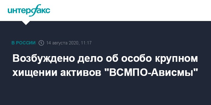 Москва. 14 августа. INTERFAX.RU - Полиция 31 июля возбудила уголовное дело по фактам хищения активов ПАО "Корпорация "ВСМПО-Ависма" в особо крупном размере, сообщил "Интерфаксу" замначальника ГСУ ГУ МВД по Свердловской области Максим Чаплыгин.