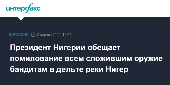 Москва. 3 апреля. INTERFAX.RU - Президент Нигерии Умару Яр-Адуа заявил, что гарантирует помилование всем бандитам, действующим в нефтеносном районе дельты реки Нигер, если они готовы сложить оружие, сообщает южноафриканский информационный канал "Ньюз-24".