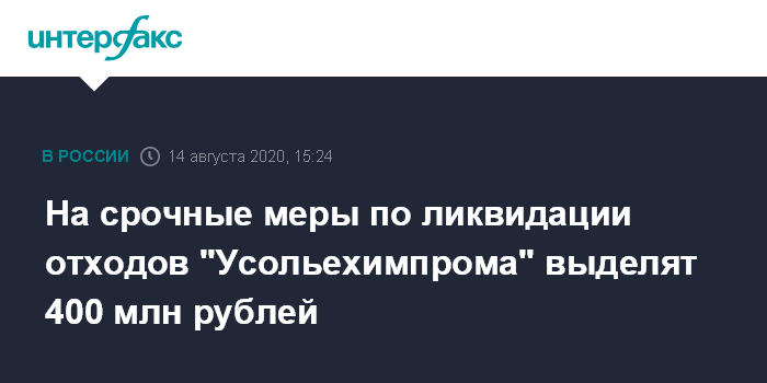 Москва. 14 августа. INTERFAX.RU - Правительство выделит в 2020 году 400 млн рублей на первоочередные меры по ликвидации отходов "Усольехимпрома" в Усолье-Сибирском. Как сообщили в пресс-службе вице-премьера Виктории Абрамченко, межведомственная рабочая группа 14 августа утвердила список первых шагов.