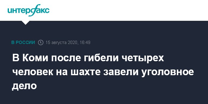 Москва. 15 августа. INTERFAX.RU - В республике Коми по факту гибели четырех человек на шахте "Воргашорская" возбуждено уголовное дело, сообщила в субботу пресс-служба СК РФ.