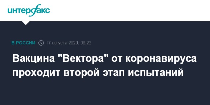 Москва. 17 августа. INTERFAX.RU - Вторая российская вакцина от коронавируса, которую разработали в научном центре вирусологии и биотехнологии "Вектор", проходит второй этап клинических испытаний, заявила глава Роспотребнадзора Анна Попова.
