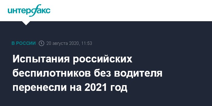 Москва. 20 августа. INTERFAX.RU - Испытания в России беспилотных автомобилей в полностью автономном режиме, без инженера-водителя, перенесли с осени на I–II квартал 2021 года, пишет газета "Ведомости".