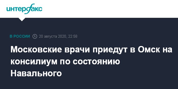 Москва. 20 августа. INTERFAX.RU - Анестезиологи-реаниматологи и нейрофизиологи национального медико-хирургического центра имени Н. И. Пирогова и национального медицинского исследовательского центра нейрохирургии имени академика Н. Н. Бурденко прибудут в пятницу в Омск для проведения расширенного консилиума о лечении оппозиционера Алексея Навального, сообщает минздрав Омской области.