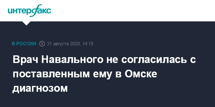 Москва. 21 августа. INTERFAX.RU - Лечащий врач оппозиционера Алексея Навального, находящегося в реанимации в омской больнице, не доверяет вердикту местных медиков.