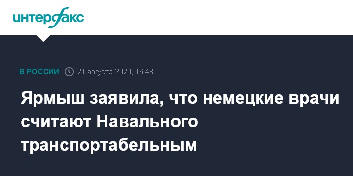 "Немецкие врачи - профессиональные реаниматологи - осмотрев Алексея Навального, пришли к выводу о том, что он транспортабелен, и оборудование их самолета позволяет безопасно немедленно перевезти его в Берлин в университетскую клинику Шарите в соответствии с желанием Юлии Навальной", - написала она.