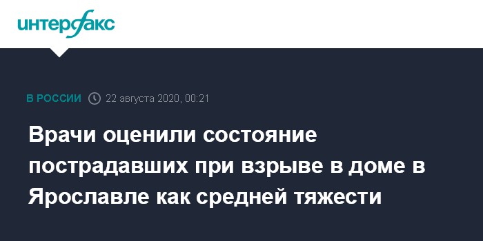 Москва. 22 августа. INTERFAX.RU - Состояние пострадавших при взрыве в многоквартирном доме в Ярославле - средней тяжести, сообщил журналистам начальник ГУ МЧС по региону Олег Бочаров в пятницу вечером.