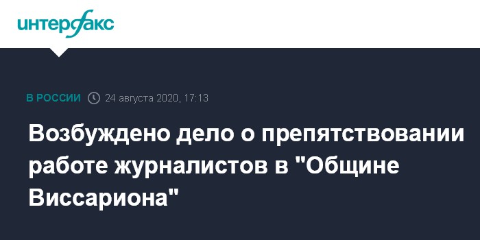 Москва. 24 августа. INTERFAX.RU - В Красноярском крае возбуждено уголовное дело после срыва подготовки репортажа о религиозной общине "Церковь Последнего Завета", которая также называет себя Общиной Виссариона. У журналистов МИЦ "Известия", готовивших сюжет, отобрали мобильные телефоны и аппаратуру, сообщили в СК.