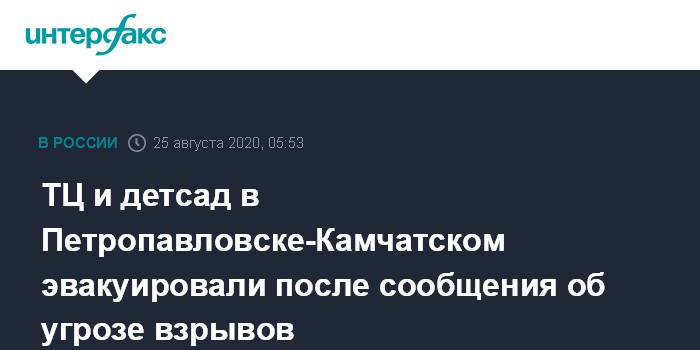 Москва. 25 августа. INTERFAX.RU - Посетителей и персонал сразу нескольких торговых центров и детсада эвакуировали во вторник в Петропавловске-Камчатском из-за сообщений о минировании этих зданий, сообщили агентству "Интерфакс" в пресс-службе управления МВД России по Камчатскому краю.