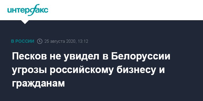 Москва. 25 августа. INTERFAX.RU - В Кремле не видят какой-либо угрозы для российских граждан и российского бизнеса в Белоруссии, заявил пресс-секретарь президента РФ Дмитрий Песков.