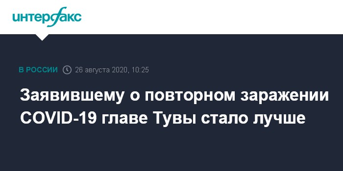 24 августа глава Тувы Кара-Оол сообщил, что заразился коронавирусом во второй раз. Его перевезли для обследования в Москву, но Минздрав РФ пока не подтвердил повторное заражение.