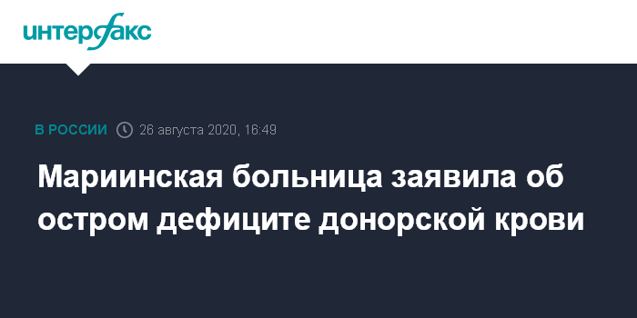 Москва. 26 августа. INTERFAX.RU - Мариинская больница Санкт-Петербурга остро нуждается в донорской крови, поскольку из-за коронавируса поток добровольцев ослаб, сообщили "Интерфаксу" в пресс-службе учреждения в среду.
