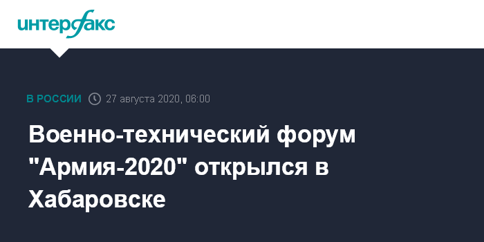 Москва. 27 августа. INTERFAX.RU - Главная площадка военно-технического форума "Армия-2020" начала работу в Хабаровске, сообщает пресс-служба Восточного военного округа (ВВО).