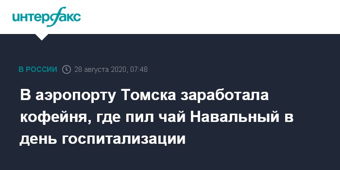 Москва. 28 августа. INTERFAX.RU - "Венская кофейня" в аэропорту "Томск", где 20 августа пил чай оппозиционный политик Алексей Навальный перед вылетом в Москву, работает в обычном режиме, сообщили агентству "Интерфакс" в пресс-службе воздушной гавани в пятницу.
