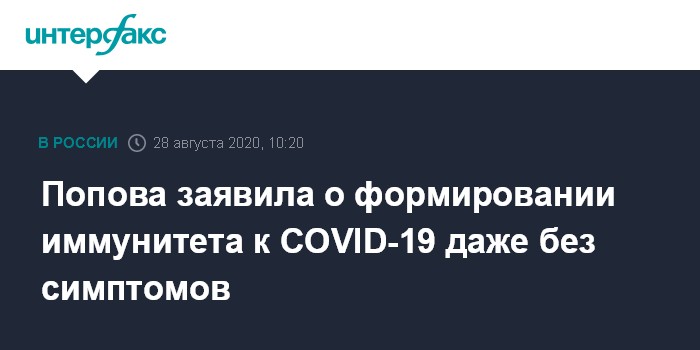 Москва. 28 августа. INTERFAX.RU - Глава Роспотребнадзора Анна Попова заявила, что, по последним данным исследований, иммунитет к новой коронавирусной инфекции формируется в том числе у тех пациентов, у которых не было клинических проявлений болезни.