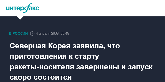 Москва. 4 апреля. ИНТЕРФАКС - Северокорейская ракета-носитель с экспериментальным спутником связи готова к запуску с полигона на восточном побережье страны, сообщает британская телерадиокорпорация Би-Би-Си со ссылкой на северокорейское государственное информагентство ЦТАК.