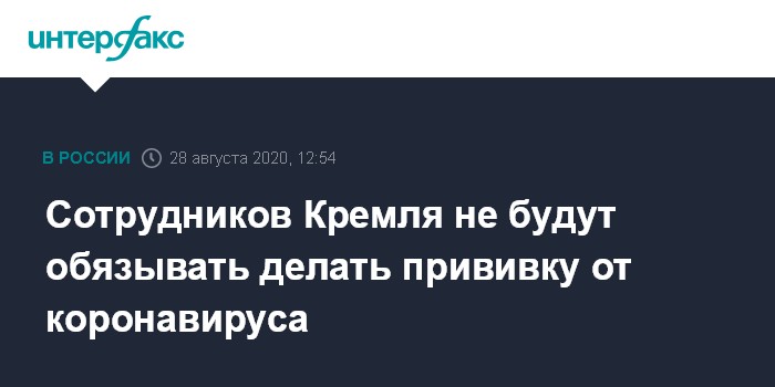 "Я не исключаю, что кто-то (из сотрудников администрации президента - BA) мог стать добровольцем и в качестве добровольца принимать участие в ранних стадиях испытания вакцины, но, конечно, о каком-то тотальном и обязательном вакцинировании речи идти не может. Когда вакцина будет доступна не только для участников испытаний, но и для всех желающих, каждый будет сам принимать решение", - сказал Песков, отвечая на вопросы журналистов.