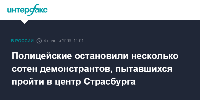 Москва. 4 апреля. INTERFAX.RU - Столкновения между французскими полицейскими и несколькими сотнями демонстрантов, стремившихся пробраться в центр Страсбурга, где проходит саммит НАТО, произошли в субботу утром.