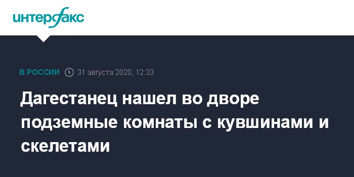 Москва. 31 августа. INTERFAX.RU - Житель села Уркарах Дахадаевского района Дагестана, благоустраивая двор, нашел на глубине пять-шесть метров две комнаты, посередине которых были скелеты. На полках в комнатах стояли старинные кувшины. В село отправятся археологи, сообщила администрация района.