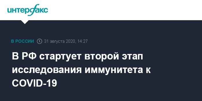 "Роспотребнадзор сообщает, что с 31.08.2020 стартует второй этап исследовательского проекта по оценке уровня популяционного иммунитета к COVID-19 среди населения Российской Федерации. Второй этап начнется в четырех субъектах РФ: Санкт-Петербург, Ленинградская область, Тюменская область и Хабаровский край", - говорится в сообщении пресс-службы Роспотребнадзора, поступившем в "Интерфакс" в понедельник.