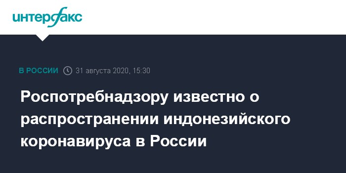 Москва. 31 августа. INTERFAX.RU - Штамм коронавируса, вызывающий COVID-19, о котором недавно объявили в Индонезии, с февраля известен ученым. Он широко распространен в мире и в России в частности, и нет оснований полагать, что он вызывает болезнь в более тяжелой форме, заявили в пресс-службе Роспотребнадзора.